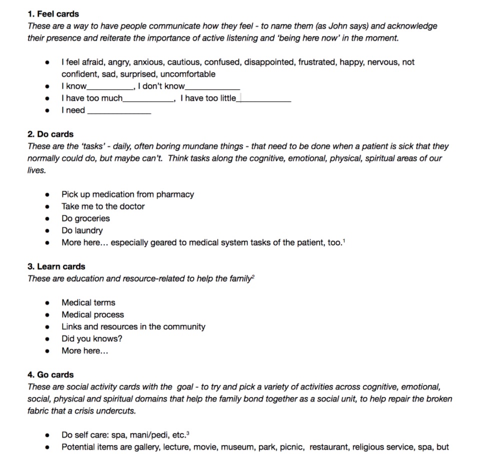 This was the final set of categories for cards we presented, but we see a key part of this system as the expansiveness – so having user generated content to make this a living system that reflects its users. Cards for categories that respond to cultural sensitivities, different types of caregiver situations or different types of illnesses could occur to meet the needs of users