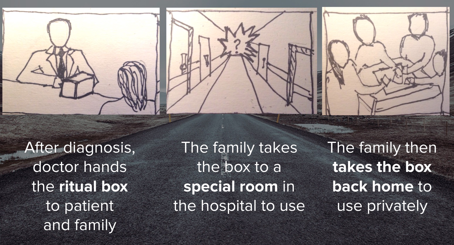 We also used film as an ethnographic method to understand the story of one such family dealing with a crisis. One of our incredible professors, John Bruce, was not only a strategist but a filmmaker and end of life doula. (Our other professor, Patty Beirne, was no less incredible – a visionary working in innovation at Memorial Sloan Kettering Cancer Care). The use of film for us as a team allowed us to tell a very personal story of one family’s struggle, the family unit being the focus of who Hum was there to assist. The concept was to show how an intervention would work in ‘the field’ rather than simply design a solution and assume our work is done. By embedding our work in a family unit such as this, and explore the issues on a more intimate scale using film we might begin to humanize our interventions. The use of film involved showing a ‘current state’ of a family in crisis, and an ‘ideal state’ after our design intervention. My role was to determine what kind of story we would write, write the script with my team, advise on the storyboard (which was documented by Javi), choose actors, direct the actors on the roles (walking them through emotional range required) produce the film (manage the project of day of shooting) ultimately editing the two films, selecting music and presenting it with the team for our final presentation.