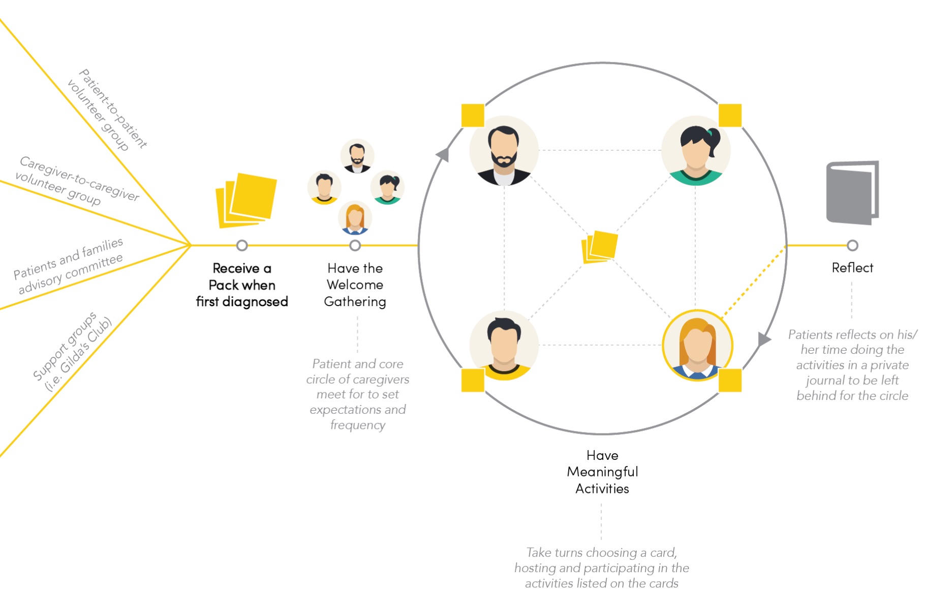 - The starting point: A patient receives a pack when first diagnosed – this can occur through multiple channels that we discovered through research. Caregivers and patients who have been through this experience are motivated to ‘give back’ by volunteering in our system