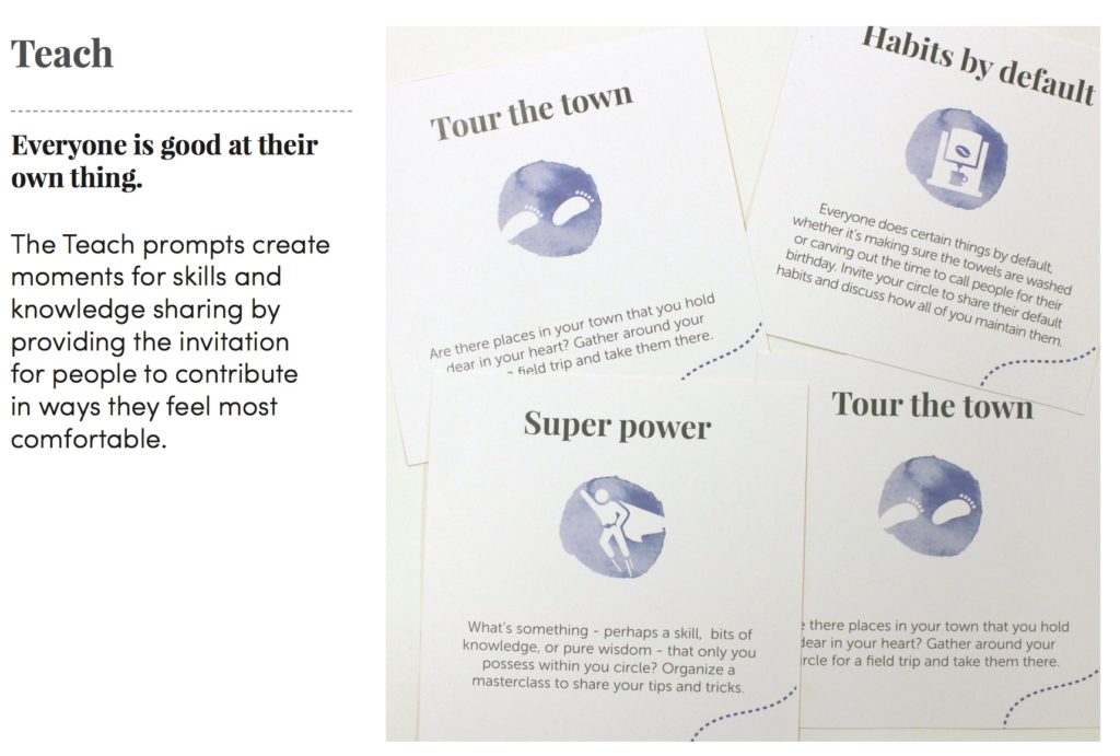 - Teach: In our research, we learned that patients who are the leading members of a family or social group can worry about what happens to the group once they are gone. Parents especially worry about knowledge transfer. The Teach Cards are geared to calm that worry by creating prompts to share skills and knowledge that go from being implicit for one person to shared wisdom amongst the group.