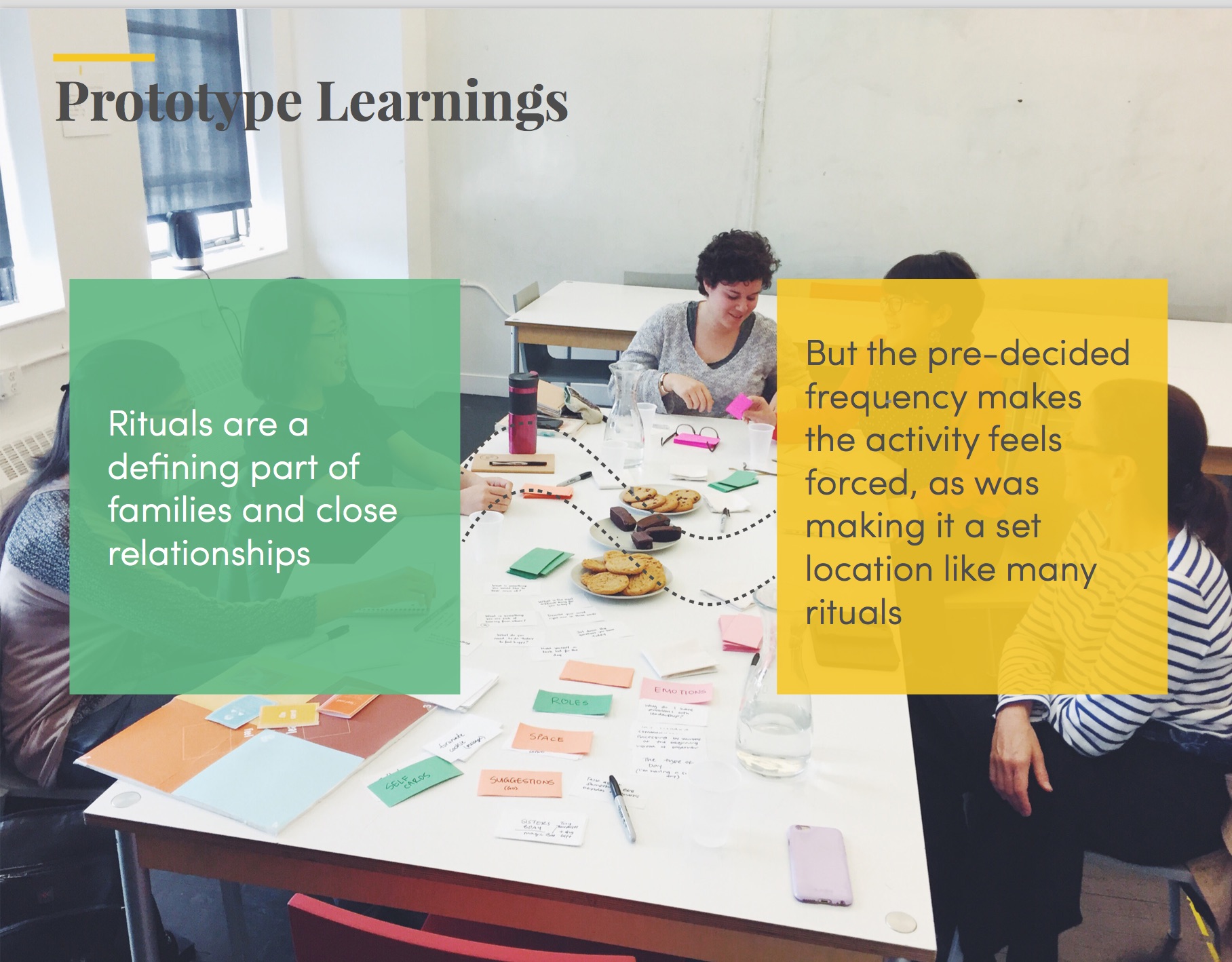A lot of this work ultimately lead to exploring in what ways might we cultivate rituals that help families prepare for tough conversations. Then we stumbled on what would be a final version of our How Might We statement: In what ways might we use rituals to encourage the fluidity of roles in order to cultivate shared leadership.[