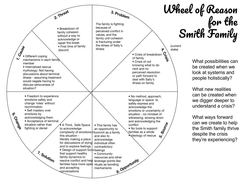 The ‘Wheel of Reason’ became a way for us to understand the situation in greater depth and begin to find a way to approach a solution. This is a great method to ensure we’re thinking holistically about a situation and to drill down to true root causes and challenge our assumptions, especially important in an emotionally charged topic.