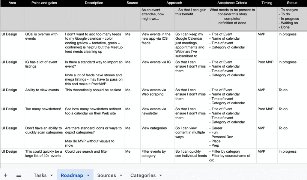 - I keep this lightweight and focused on pain points with the existing systems and processes, and how a proposed application might address them. I also spoke with others to understand how they perceive events through interviews and surveys. The Lovable community site ultimately became a source of numerous comments on the idea, which was encouraging to see. The research results of my Pains and Gains are presented in the Product Roadmap table below; research was transformed into user stories, which were then prioritized as MVP or post-MVP. I also captured all feedback into a Google spreadsheet and hope to import it into Aha! or other software.