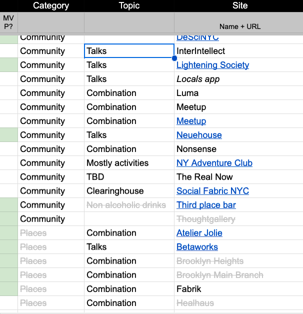 - Content: I didn’t have a good sense of how many events I could add; I had at least 40 feeds I’ve identified across email newsletters and Instagram feeds, including career (networking events), communities (usually with membership), fun (music, social clubs, personal development), and places like coffee shops who host events. Etc. We’ll dive into the content more when we start discussing users and why I narrowed the scope to health and wellness.