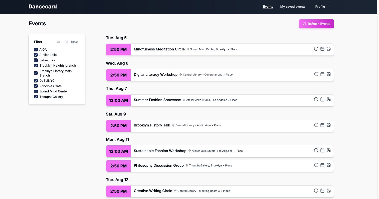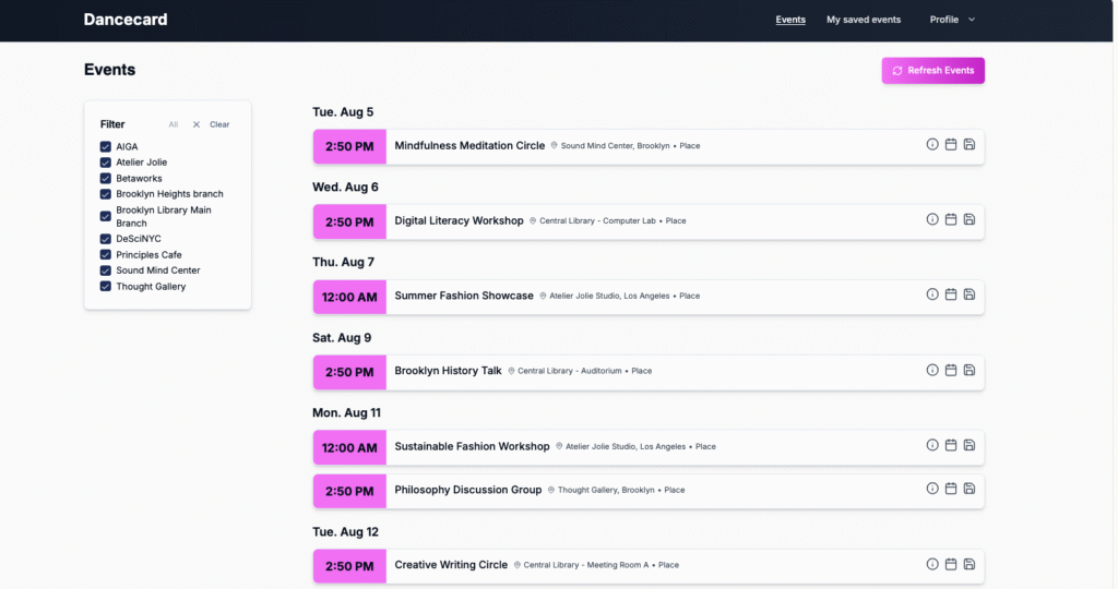 - Save events: I curated a list of events I found valuable and can save them to a ‘shortlist’ with a focus on Web scraping and Instagram event feeds.
