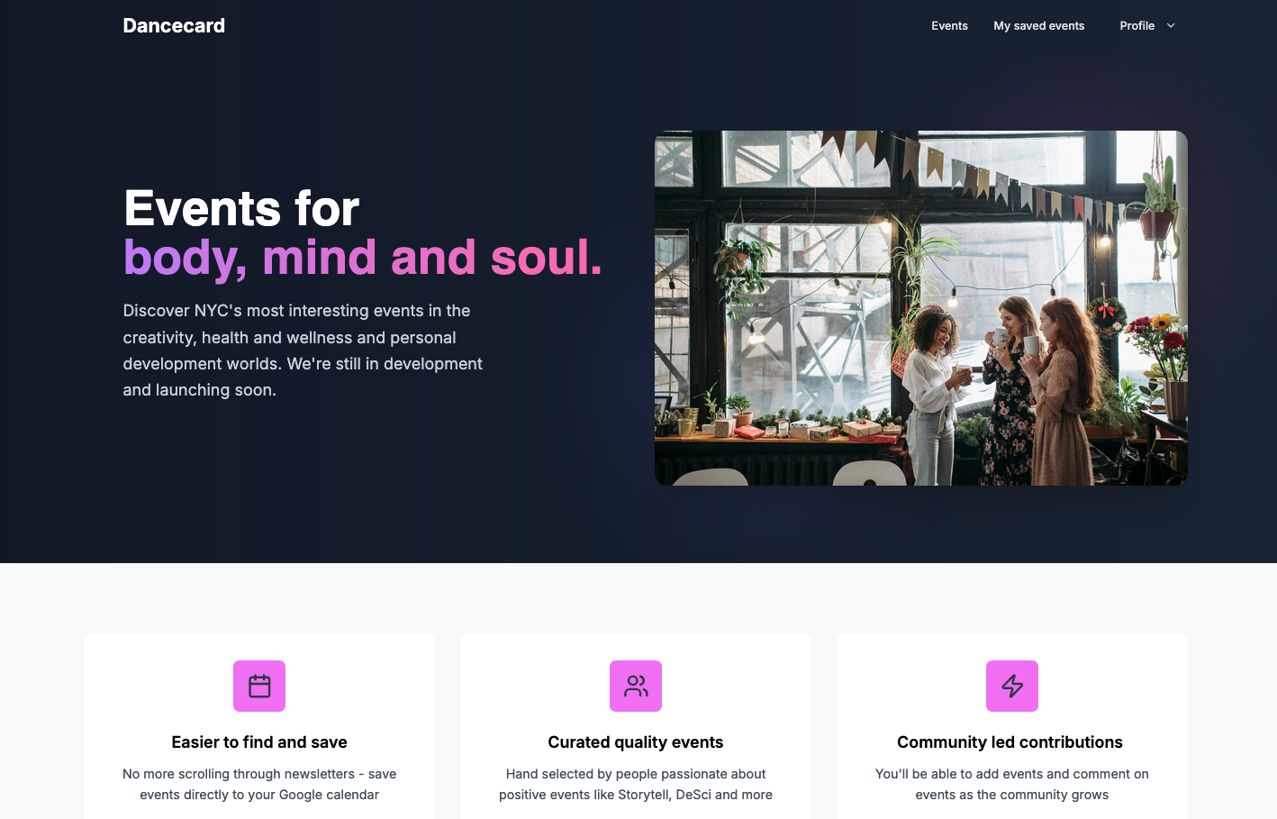 - Authentication: login, logout, and profile; the profile could be expanded in the future to share events with other Dancecard users.