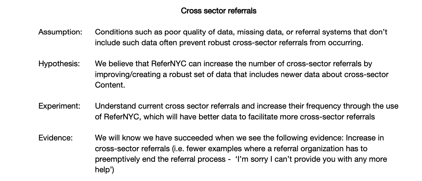 - Data ecosystem products are valuable but misunderstood: this was my first data product as a product manager, and I was excited to see the efforts grow. At the same time, many folks see Web and mobile products as a priority in civic tech, and behind-the-scenes services like ReferNYC could be seen as less urgent. There is always a sense that infrastructure products may seem easier to build, but I now wonder if we could get more excitement for the work if it had a consumer-facing angle. While we were helping New Yorkers, the end users were also non-profits, and more marketing to them of the benefits could help with evangelism that data products are valuable.