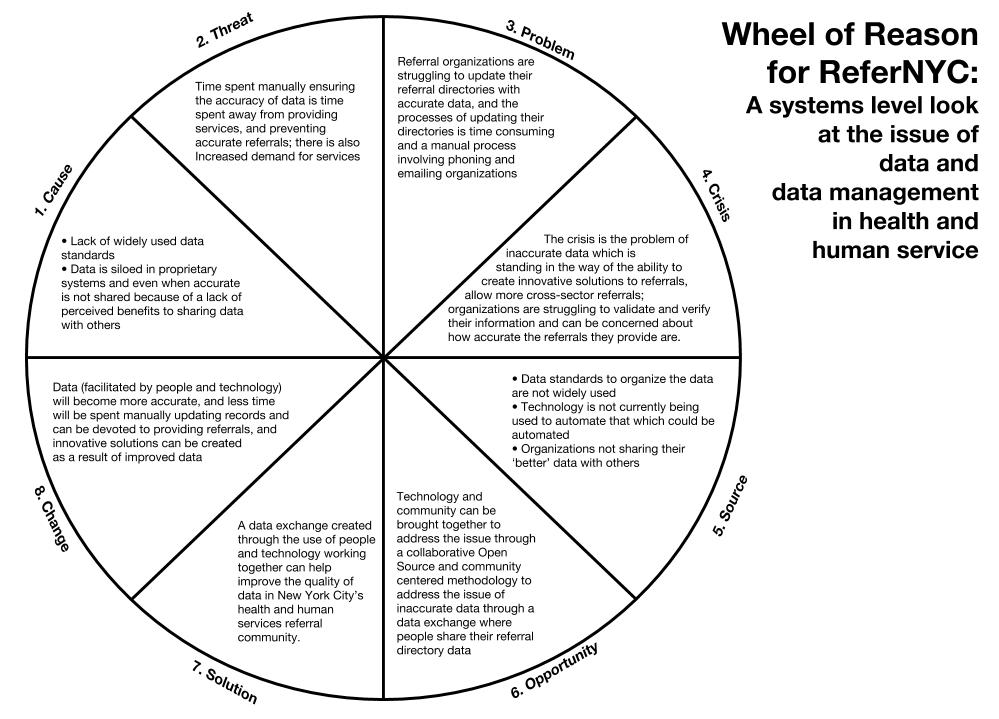 - Vision: Our goal was to understand how access to resources like referrals affects New Yorkers, especially those vulnerable to becoming homeless, involved in the Criminal Justice system, or any other health and human services scenarios. The work of Civic Hall Labs was tied to these Civic Determinants of Health to understand how to scale out participatory design within an R&D project. The vision was an interoperable, comprehensive, and accurate directory for non-profits by developing an Open Data Exchange.