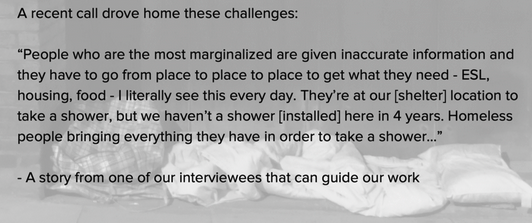 - Insight: End users – non profit community organizations—didn’t have the time to update information about other nonprofits to refer people to. They didn’t want to just ‘Google’ it, and wanted to be able to have custom CRM that had organizational history while also having referral info.