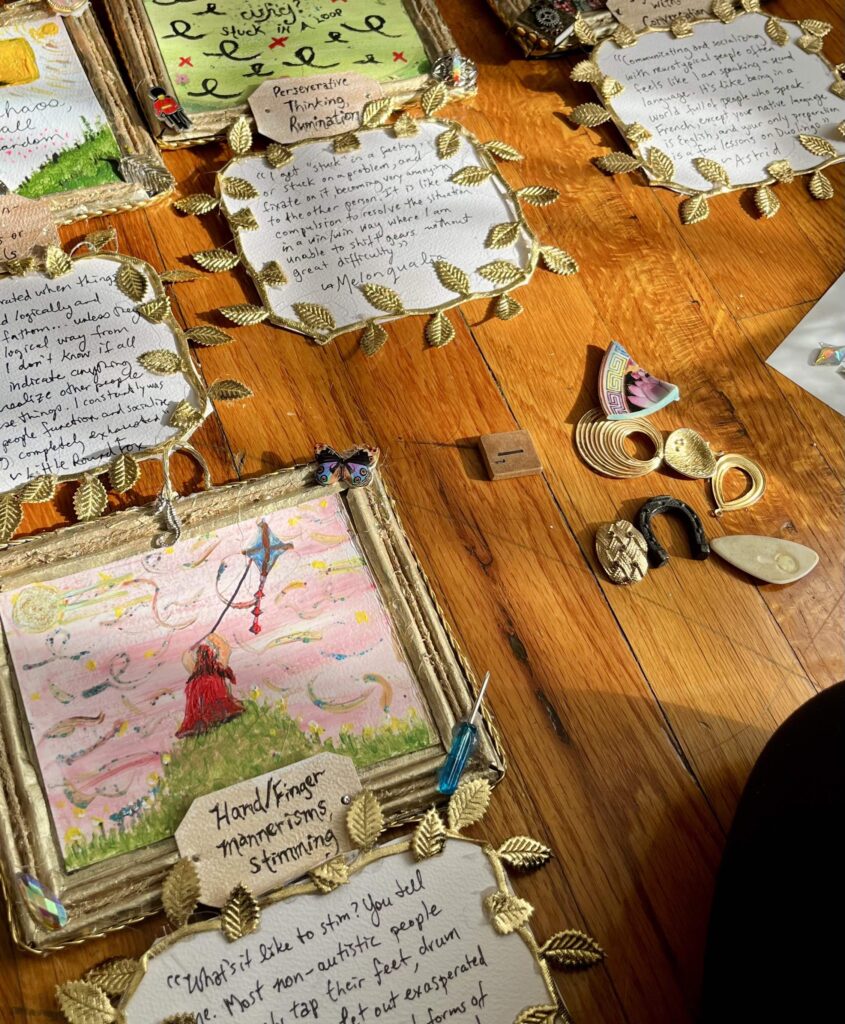 This piece brings those struggles into view. Using women’s fashion to represent gender, the symptoms for autism from the Diagnostic and Statistical Manual of Mental Disorders, Fifth Edition (DSM-5 are written out in gold on the top part of the dress. First-person narratives from the Internet are then accompanied by a painted vignette depicting the symptoms. The clinical symptoms are a ‘medical version’ of us. At the bottom are paintings and personal stories that share how those symptoms show up in our lives. The masks we wear are covered with labels like ‘compliant’, ‘people-pleaser’ and ‘perfectionist’ to symbolize the roles imposed on us. At the center is a heart, reminding us that beyond the medical words and masks lies our true, unmasked selves.